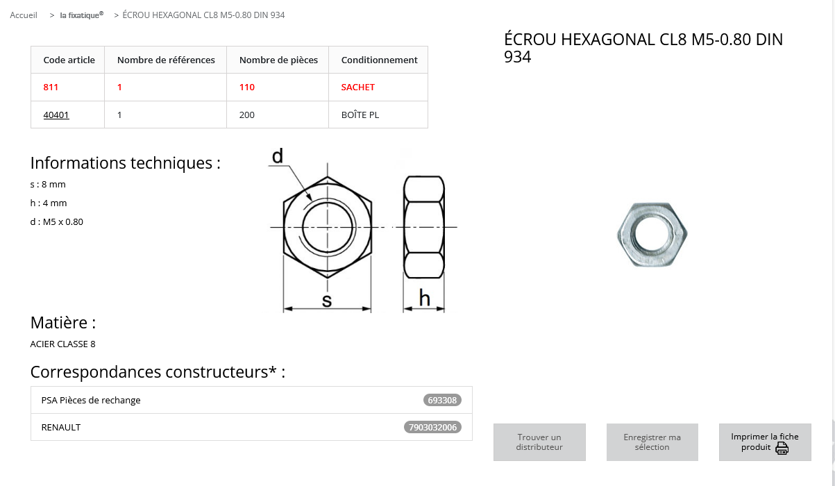 quantité de ECROU 6 PANS 5X0,80 (sachet de 110 pcs)