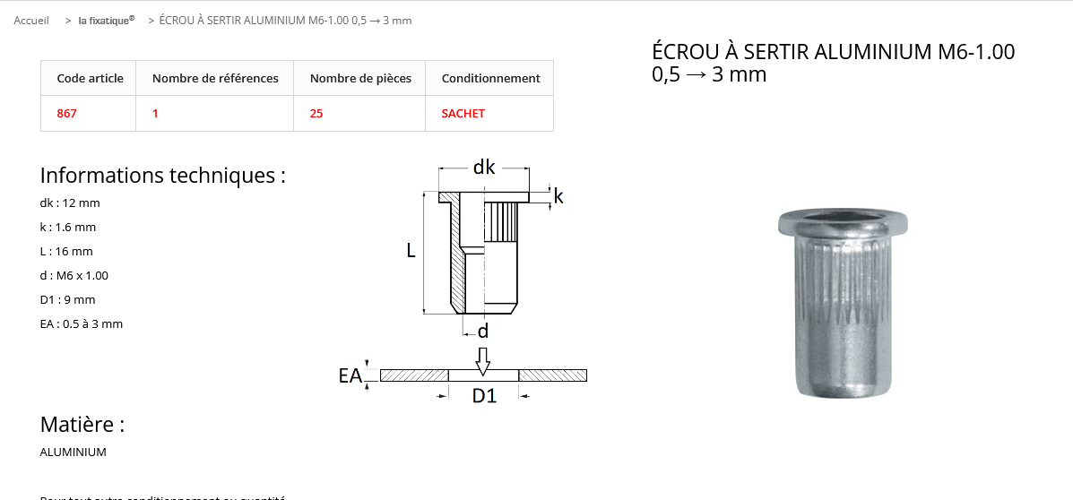 quantité de ECROU A SERTIR ALU D6 (sachet de 25 pcs)