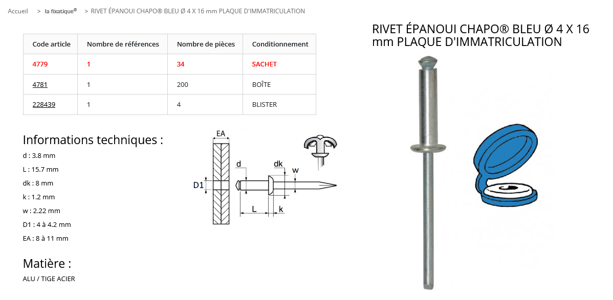 quantité de RIVET EPANOUI 4.X16 BLEU (sachet de 34 pcs)